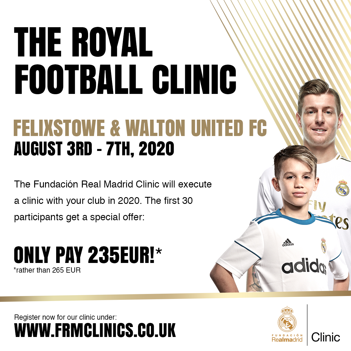 The Royal Football Clinic (Fundacion Real Madrid) returns to Felixstowe & Walton United FC next August and there's a special 'early bird' offer for the first 30 to sign up in the next 14 days!