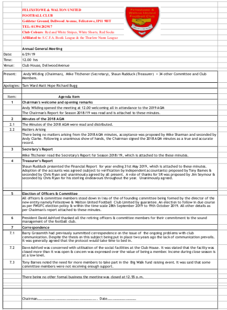 The AGM of Felixstowe Walton United FC shall take place on the concourse outside the clubhouse at 12:00 hrs Saturday 11th July