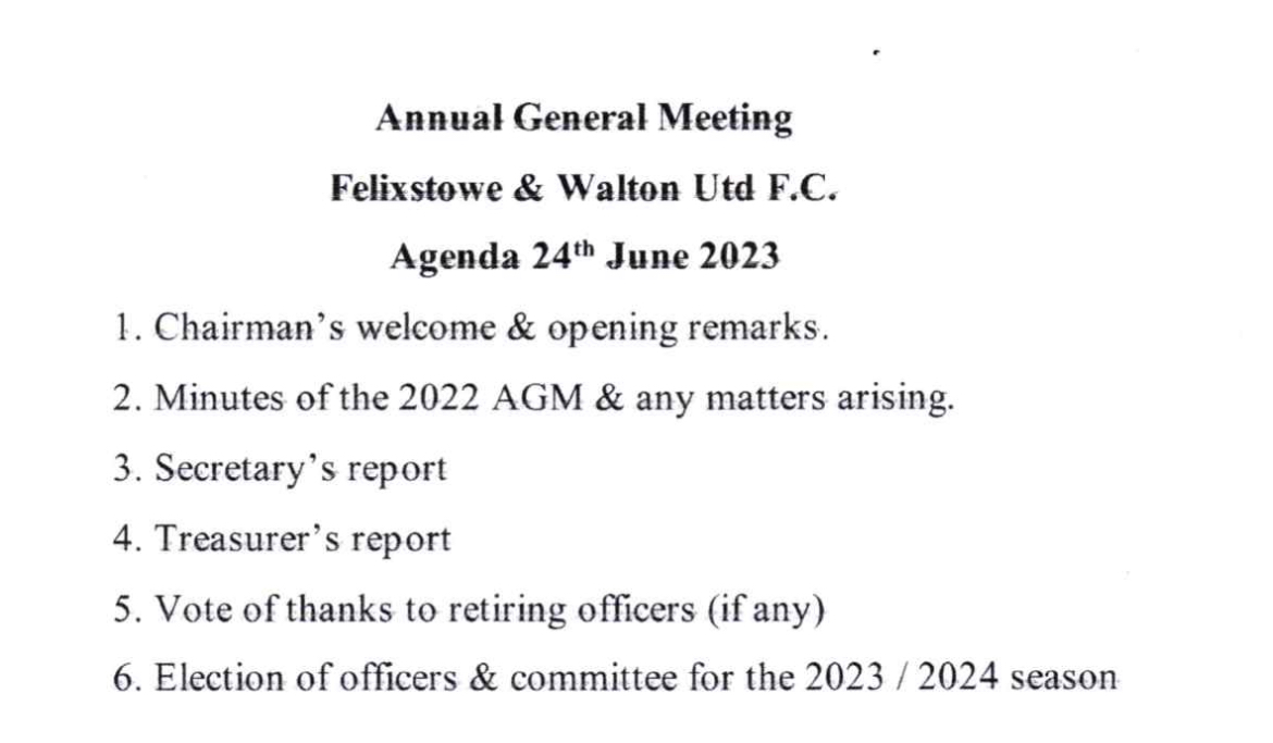 The directors of Felixstowe & Walton Utd. F.C. hereby give notice that the Annual General Meeting will be held on Saturday the 24th of June 2023 at 13.00 hrs.