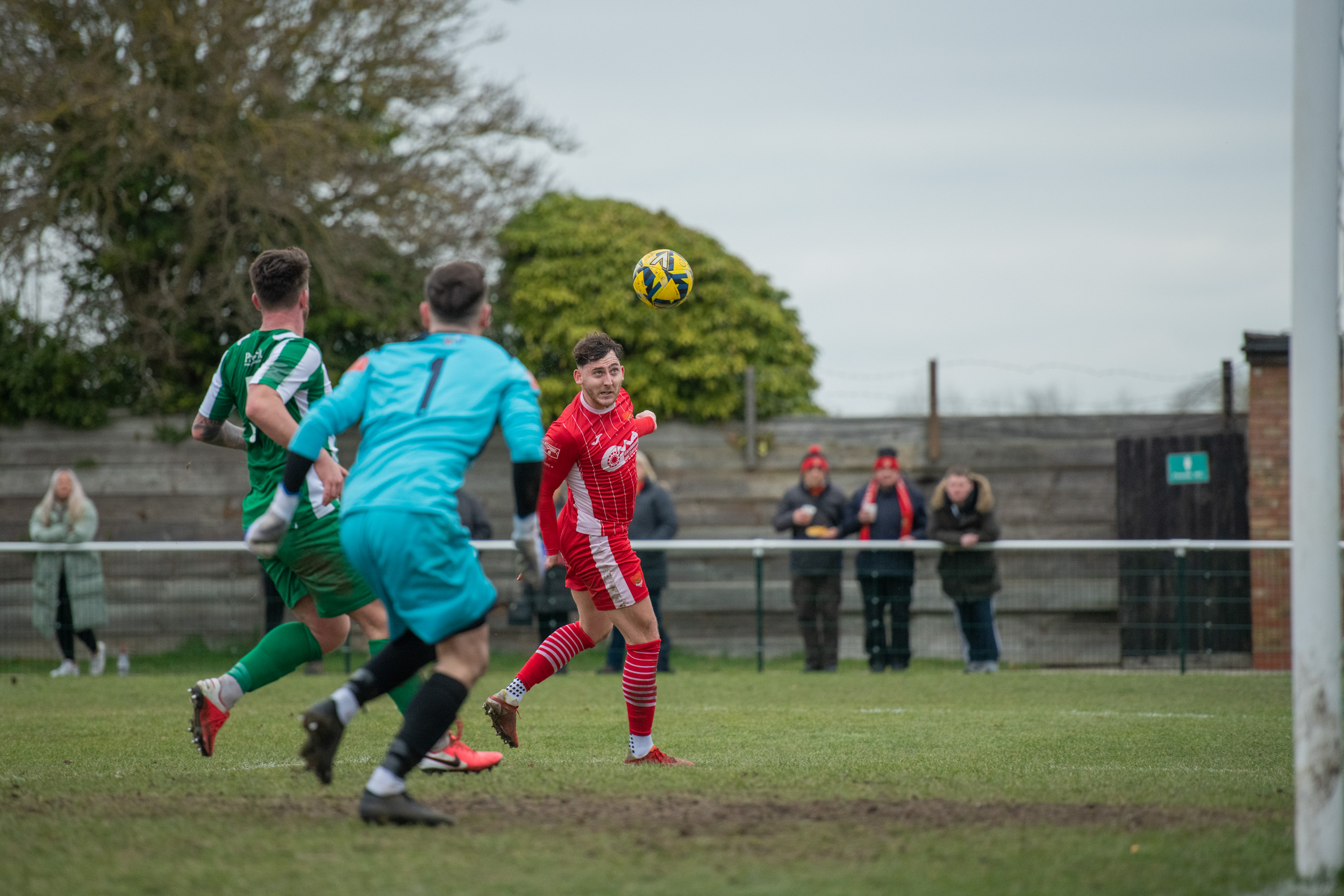 Similar to that at Tilbury a fortnight ago, the pitch was not in a condition that suited Felixstowe’s style of play but they adapted well after a quiet start that had seen the home side have more of the ball and looking energetic rather than particularly capable of piercing the Seasiders rear-guard, despite playing four men up front for the first half an hour. The first chance for Felixstowe fell to Billy Holland on 12 minutes, his firm header from a corner going wide of the back post from a great position. George Clarke was bulldozing his way forward at every opportunity and he was set clear by Josh Hitter on 20 minutes, he rounded the goalkeeper inside the box but a combination of the keeper and his two defenders allowed the ball to be cleared to safety. Rovers seemed incapable of playing the offside trap throughout the game and time and time again, Felixstowe breached the defensive line with through balls which Clarke and Charlie Warren were lapping up. George Clarke knocked the ball down for Leon Ottley-Gooch to send in a piledriver from 25 yards on 25 minutes but the goalkeeper did well to keep it out. Two minutes later and Ottley-Gooch was not to be denied, and he scored his second goal of the week, following his effort at East Thurrock on Tuesday. Clarke had seen his effort cleared off the line and out, but quick feet from Warren and Barley saw a cross come back into the six-yard box for Ottley-Gooch to evade his marker and slam the ball home from close range. George Clarke was taken off straight away and replaced by Zak Brown after going down under a challenge in the lead up to the goal, and Brown was immediately carrying on Clarkes job of making it a difficult afternoon for the home defence, his first task was to win the ball in his own half and sprint through the opposition half, beat two defenders and spread the ball to Josh Hitter, he returned the favour to Brown in the box but the goalkeeper scrambled the effort away. The need for the second goal was evident on 38 minutes when the home side nearly equalised, the lively Harry Brown at number nine produced a fierce shot from 16 yards that Callum Robinson did brilliantly to keep out at ground level, with the ball spinning away towards the goal before being cleared. That crucial goal did come for the Seasiders as the clock ticked over into added time at the end of the first half, again Zak Brown was unplayable up top and his burst forward resulted in a high cross to the far edge of the six-yard box which Josh Hitter was steaming towards, and he converted brilliantly from a tight angle to get the goal his first half display had deserved. Joe Whight, a pillar of strength at the back, showed his abilities higher up the field too before the whistle, his free kick from 20 yards out on the right looking like extending the lead before the goalkeeper pulled off a fine save at the near post.