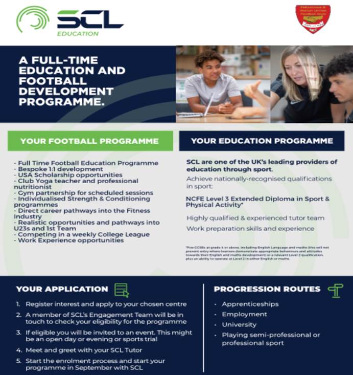 Our academy operates as an SCL Education Centre providing full-time education and football development programmes for 16–18-year-olds to achieve an NCFE Level 3 Extended Diploma in Sport & Physical Activity, facilitating progression to Apprenticeships, Employment, University & Playing semi-professional, or professional sport.