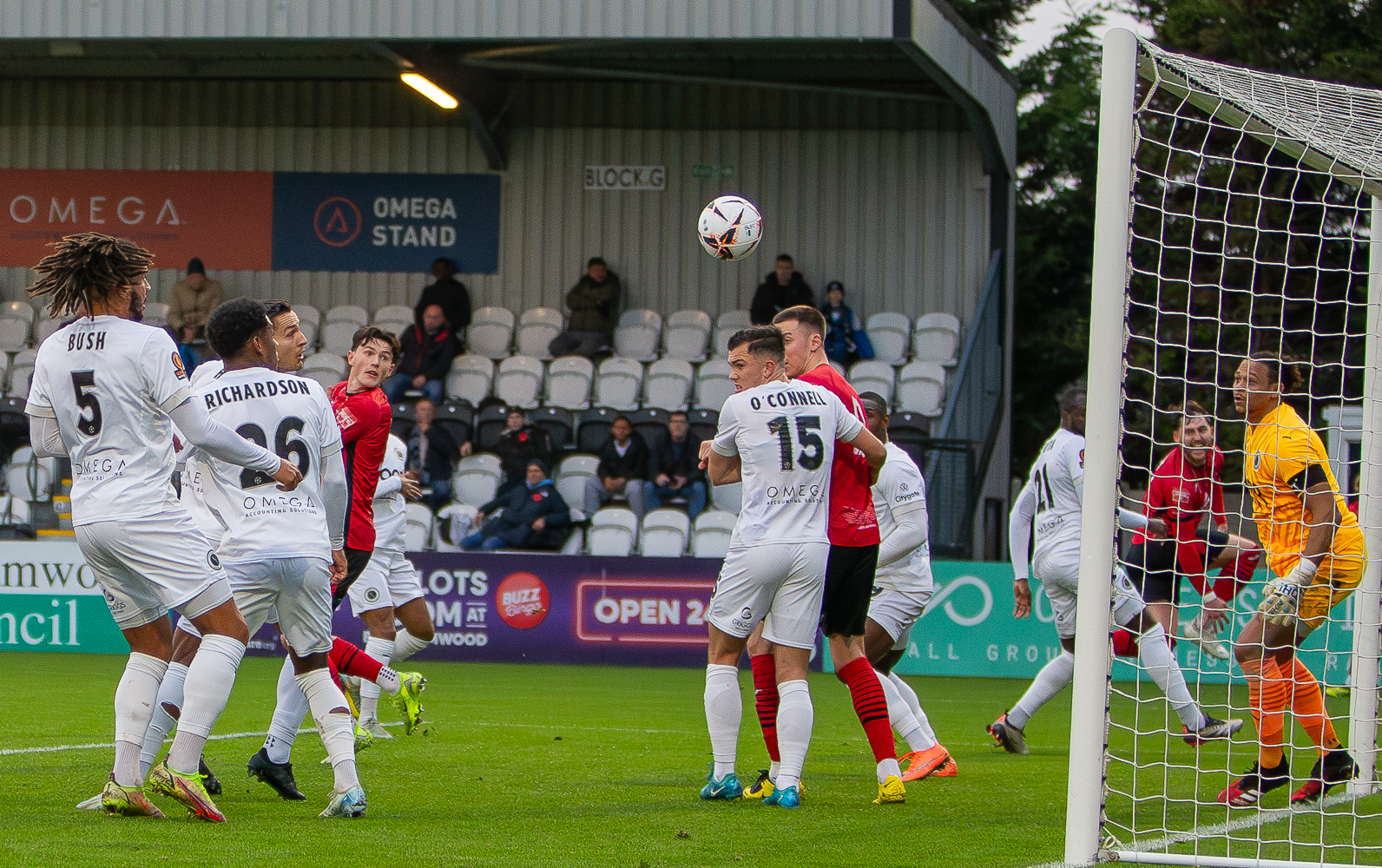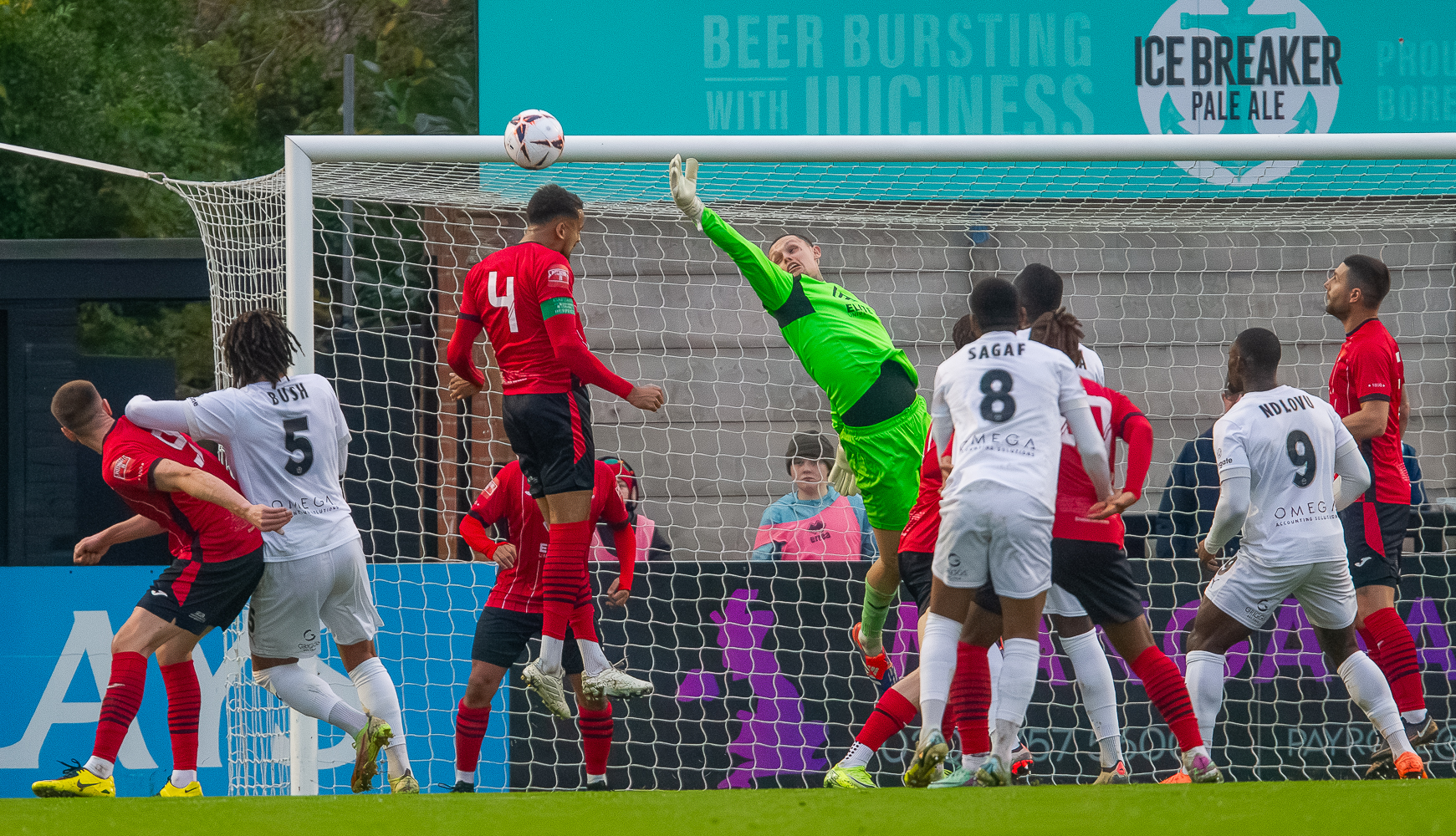 The second half started where it left off, with Boreham Wood on top. Sagaf’s shot was deflected onto the crossbar on 48 minutes and Dixon wasted his effort shortly after, Harry Wright mopping up the ball before the follow up. With an hour played and numerous home substitutions ramping up the pressure, it did seem like a matter of time before the home side equalised. Felixstowe were penned back and only having brief opportunities to break forward, when they did, Josh Mayhew’s hold-up play was exceptional and the running of Charlie Warren was always a worry for the home side who had been caught out by his deft touches during the first half. Just after the hour, Clayden’s cross was nearly turned into his own goal by Hugh Cullum, and a minute later, Whelan fired just over. Substitute Tyrone Marsh fired his shot straight at Wrighty on 72 minutes and Ndlovu went close with a similar effort shortly after. With the clock ticking down and Felixstowe holding out, a poor decision by the referee to award a throw-in to the home side in error, led to the equaliser. The ball was launched into the box and a seemingly innocuous tackle near middle of the area saw the referee point to the spot, a very soft decision in my opinion. Marsh stepped up and made the scores level with just five minutes to play. Felixstowe, to their credit, could have put their heads down at that point and suffer ten minutes of pressure, including stoppage time, but instead they themselves went searching for a winner too, and a series of set-pieces caused a few worried looks in the home end as the game came to a close with the scores level at 1-1.