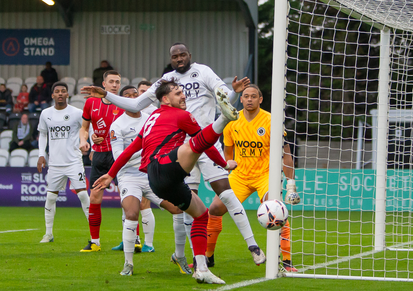 Boreham Wood showed their speed and strength straightaway, and debutant Jon Benton played in Jayden Richardson, who fired just wide on four minutes. A minute later, Cameron Forde-Brown raced down the left and crossed for Josh Mayhew whose shot deflected into the arms of the keeper. Willie Clemons shot straight at a defender whilst Charlie Warren’s clever play saw another dangerous ball threaten the home defence. Felixstowe were looking very confident and able to deal with the home threat whilst breaking regularly with crisp passing and forward running. A succession of corners led to Felixstowe’s goal on 17 minutes, the set-piece whipped across the box, taking a rebound or two before striking Josh Hitter and hitting the roof of the net, causing delirium amongst the away support. The home side were getting down the right flank regularly but finding their men in the middle was proving difficult, although one excellent Hare cross was volleyed just wide by Clayden on 23 minutes. Just before the half hour mark Josh Hitter saw his free kick on the edge of the box curl over the wall but comfortably gathered by the keeper. Hitter was then seemingly fouled in the box that looked like a clear penalty, but the referee showed little interest. For the remainder of the half, Boreham Wood started gained more possession and start to turn up the pressure. On 37 minutes, a cross was headed wide by Ndlovu. The Seasiders defence was holding out and defending well, with the nearest opportunity coming on the stroke of half-time, when both Ndlovu and Benton had shots cleared off the line.