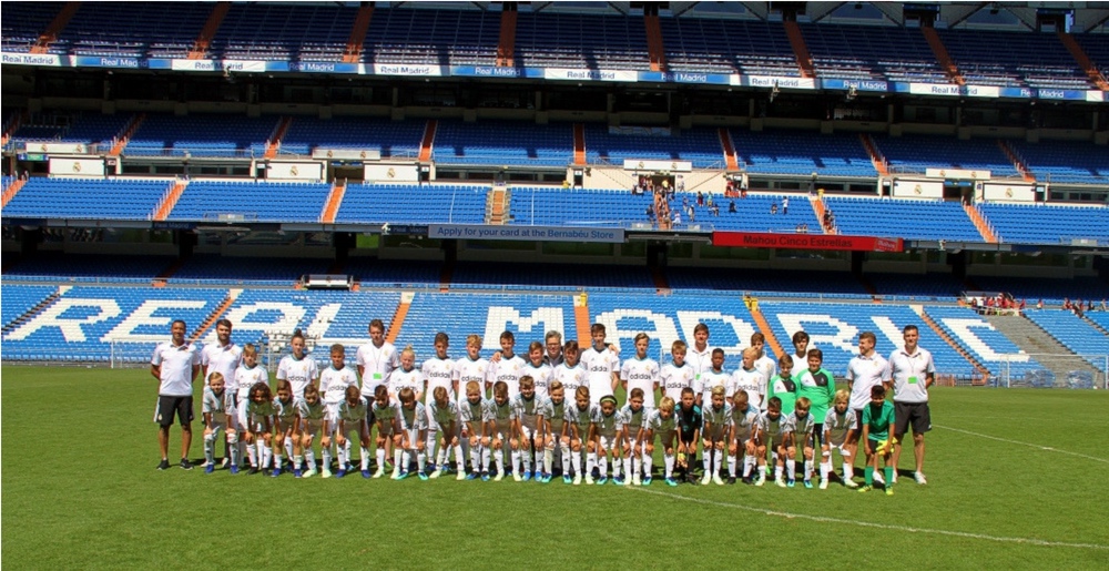 They got flights from Stansted, arrived in Madrid late Saturday morning and via the shuttle bus ended up in their hotel room by 2:00pm. Once they had collected their complimentary Real Madrid training kit, it was off by coach to the “The Ciudad Real Madrid”, the training campus of Real Madrid. Once they arrived, the two boys were introduced to the coaches and the other thirty or so children from eight different countries. A quick tour of the facilities that include accommodation, medical centre and in excess of twelve football pitches of various sizes and grass composition and then it was two hours of training in temperatures in excess of thirty degrees. What a venue.!!
